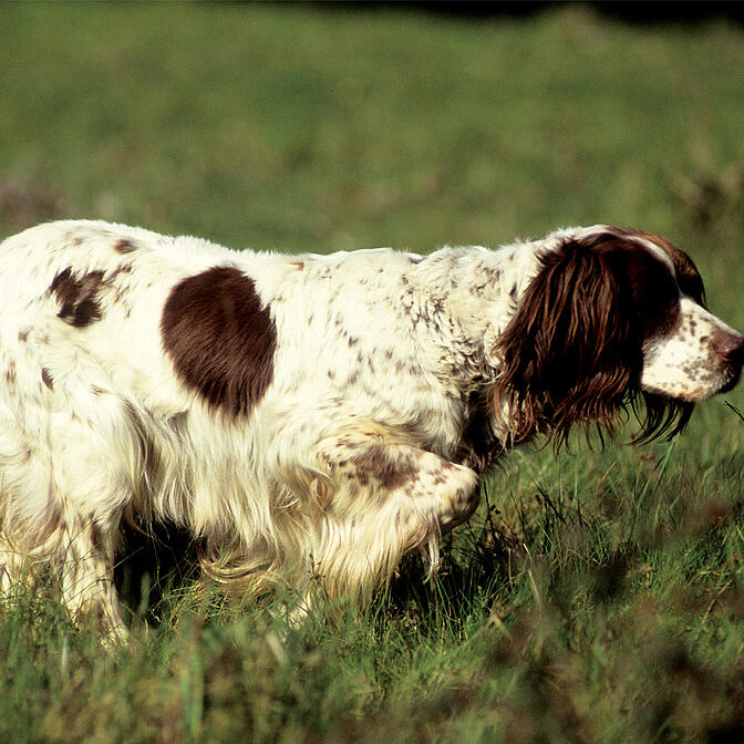 The French Spaniel loves his family and bonds strongly with them; he does not like to be left on his own at home. An enthusiastic hunter, he loves to run free in the countryside when his excellent sense of smell will send him to hunt, point and retrieve.