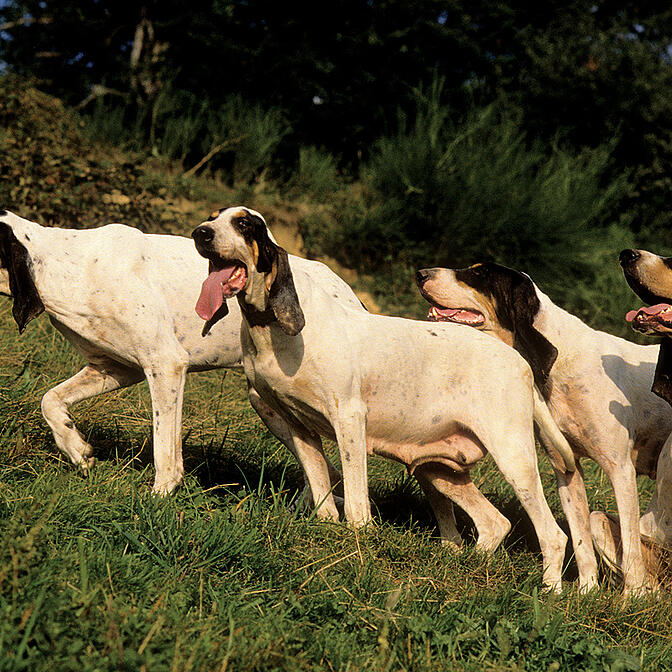 The beautiful Gascon Saintongeois Hound prefers to live outside as part of the hunt pack; they can however make an ideal companion for both hunters and family. The Gascon Saintongeois Hounds were originally bred for hunting both large and small game.