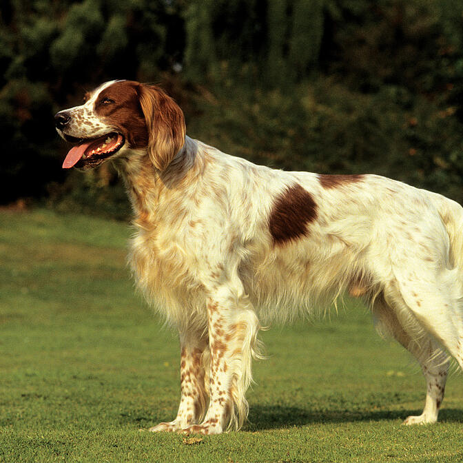 The Irish Red and White Setter is a very friendly and lively breed with high energy levels. An aristocratic, keen and very intelligent dog, the Irish Red and White Setter is very friendly and will get along with everyone. It makes an excellent companion and is affectionate in the home with its family. It can be highly-strung and independent in the field, and requires sensitive and consistent training.