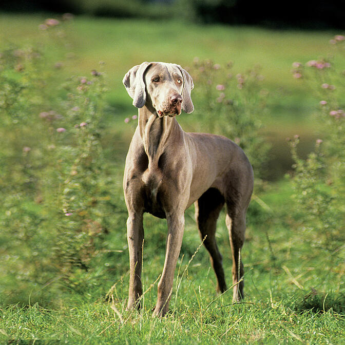 Weimaraners are magnificent large breed dogs, well-balanced and graceful, of a fine shape with a soft, smooth, grey coat. They can be exuberant.